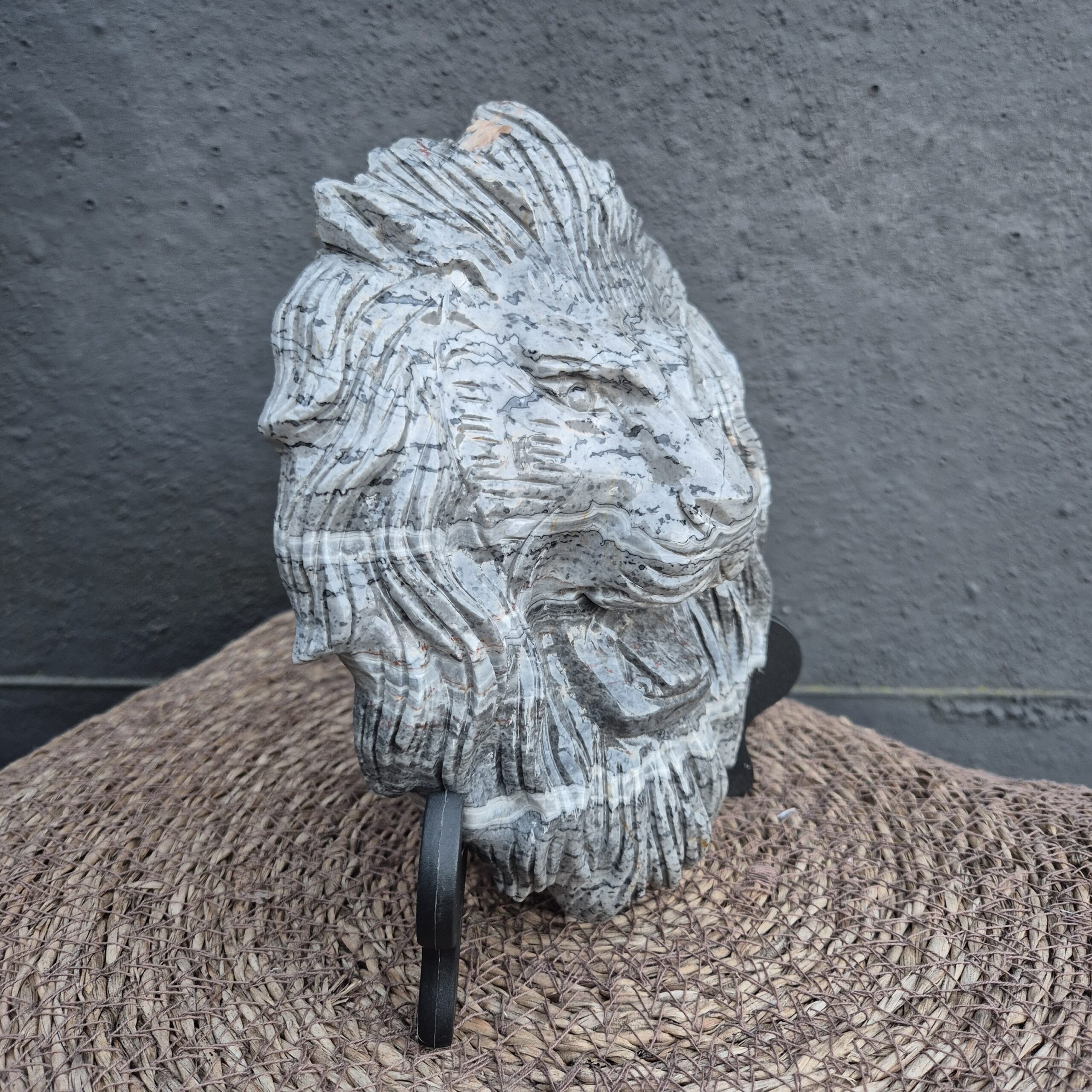 Grijze crazylace agaat leeuwenkop op standaard